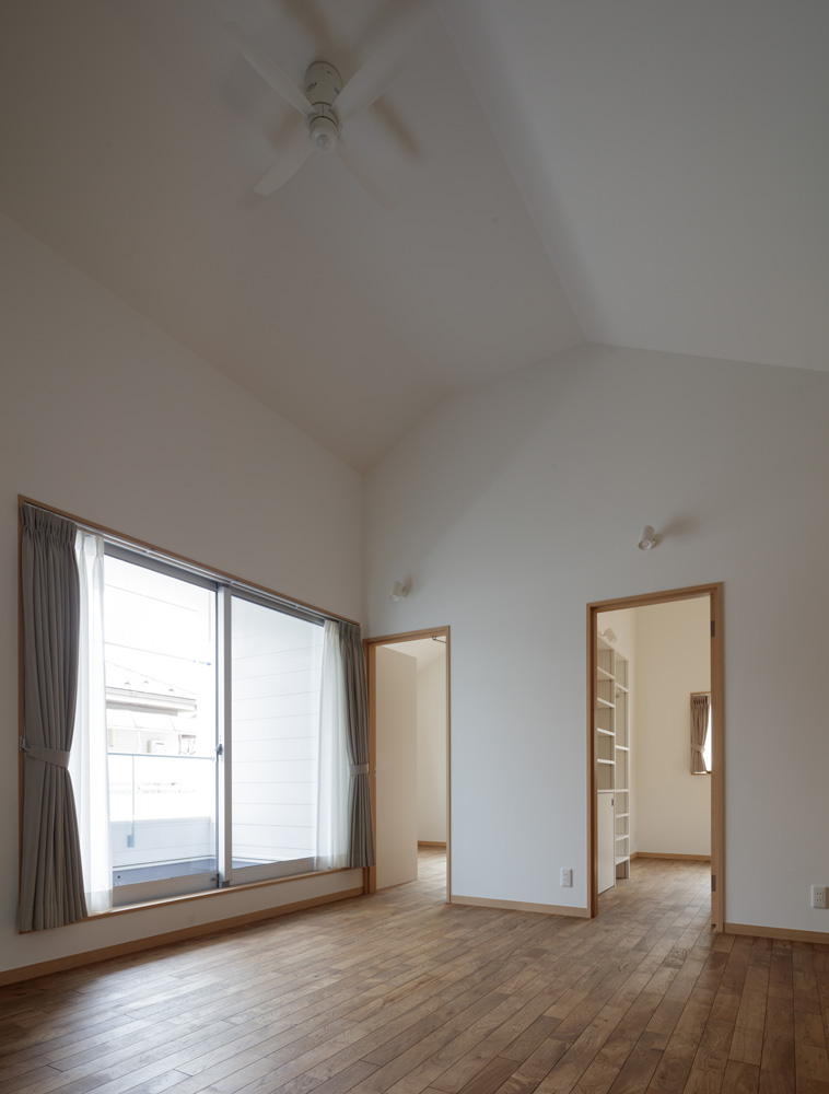 勾配天井+シーリングファンで、光と風が通り抜ける心地よい空間に。